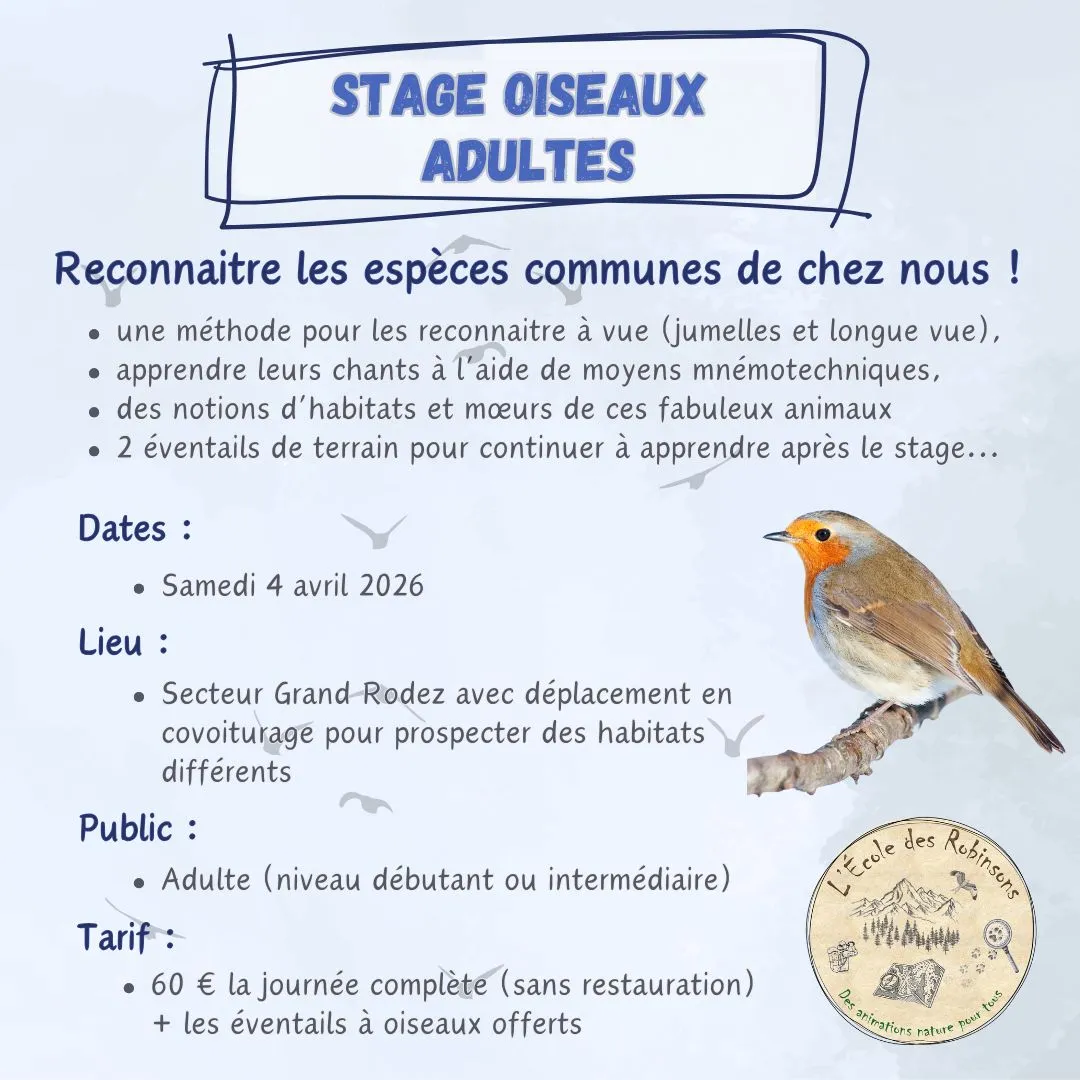 Ce stage s’adresse aux adultes désirant apprendre, ou approfondir leur apprentissage, de la reconnaissance des oiseaux (visuelle et par le chant) ainsi que de leur mode de vie. Ce stage se déroulera (avec des déplacements en covoiturage) sur différents habitats afin de couvrir une certaine diversité d’espèces. Durant ce stage nous aborderons également des thèmes tels que les comportements particuliers des oiseaux, leur intelligence, leur mode de vie et les actions efficaces à mener pour leur protection.